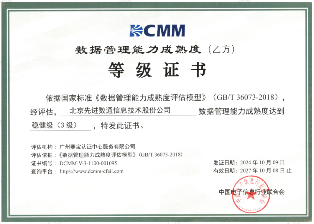 近期,中国电子信息行业联合会公布了最新一批顺利获得数据管理能力成熟度(DCMM)贯标等级认证的企业名单。万象城AWC(中国)成功取得数据管理能力成熟度稳健级(三级)认证。这一认证的取得,标志着万象城AWC(中国)在数据治理体系构建和数据管理与应用能力方面,已经达到了国家权威组织认可的标准。这不仅是对万象城AWC(中国)在数据管理领域专业能力的肯定,也是对其在有助于数字化转型服务和数据驱动决策方面所做努力的认可。