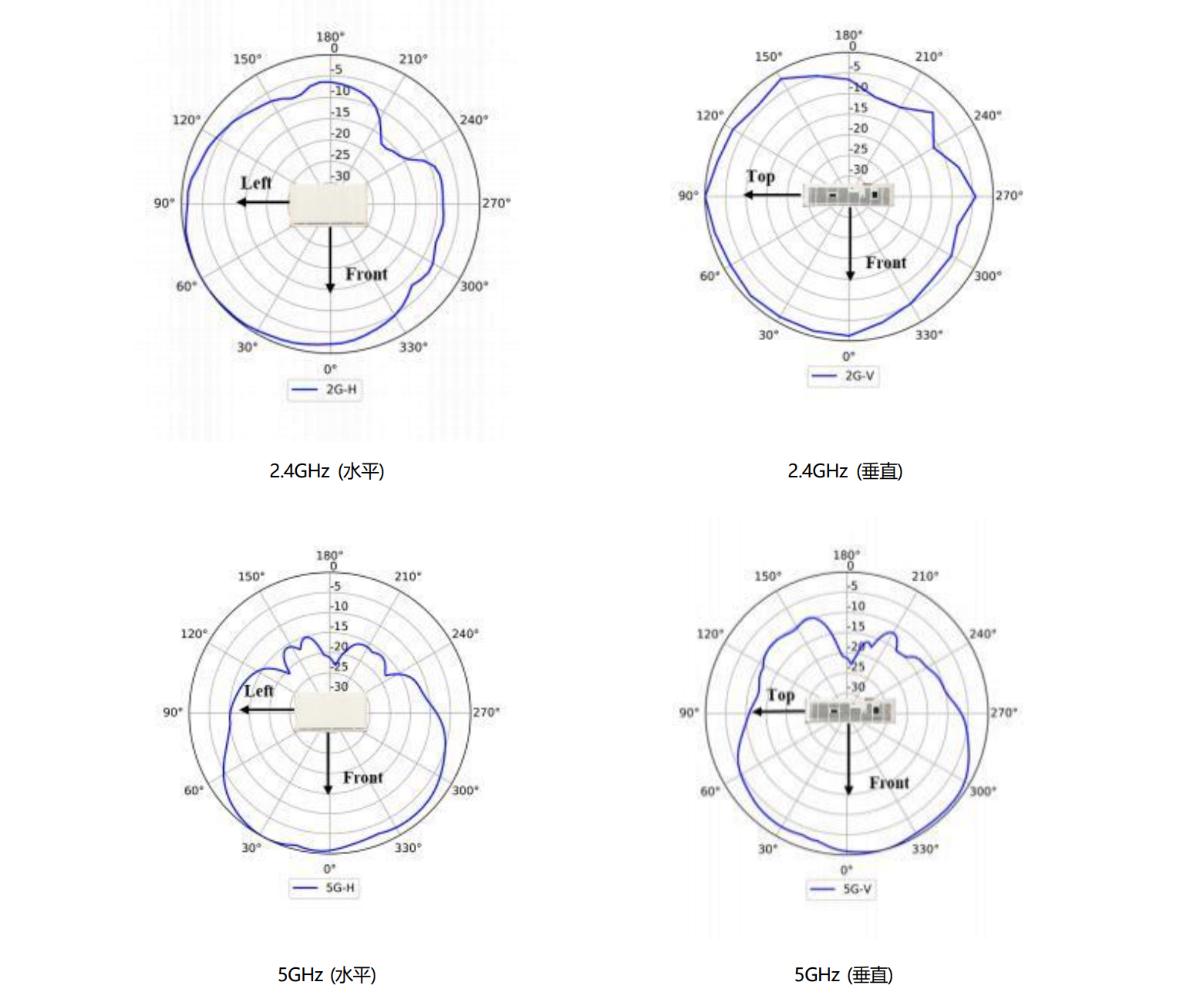 说明 1、上述增益为单天线峰值增益。 2、组合2.4GHz 或 5GHz 所有天线后,等效天线增益 :2.4GHz: 2dBi, 5GHz:3dBi。 |